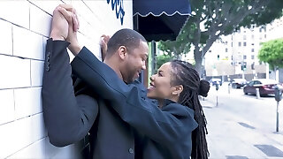 Pretty curly haired ebony chick spreads her long legs for white salami