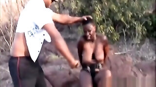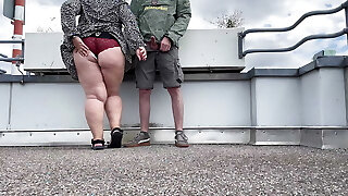 Spanking my mother in law's fantastic phat caboose while she jerks off my cock on the top of the parking lot