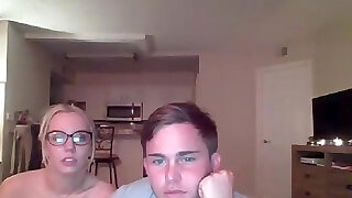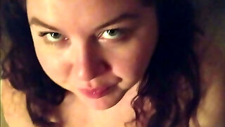 Mommy heard him jacking to porn and decided to take her boobs out and blow his dick dry! He shoots a pile of cum down her hatch!