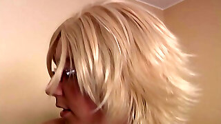 Mature nerdy whore with thick boobies is blessed to suck strong cock
