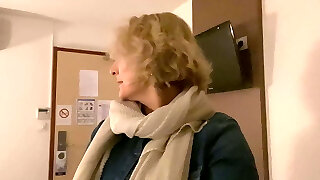 Striptease and Pee by chubby Mature nude blonde outside in the garden courtyard